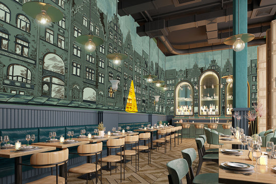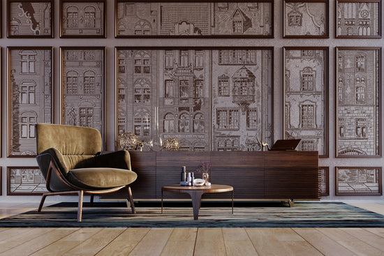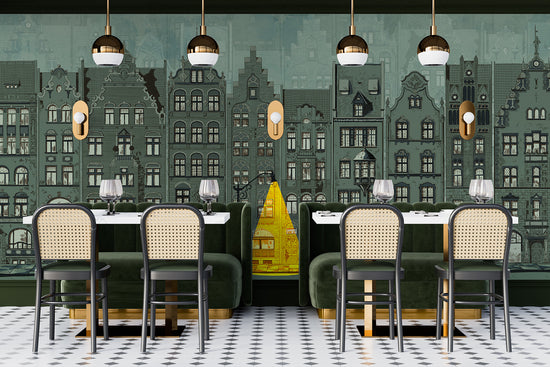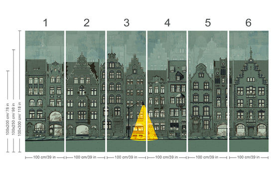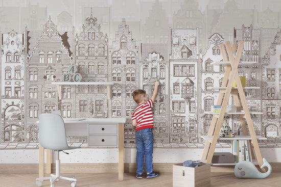 Розроблений як акцентна стіна, цей фреска з міським пейзажем додає характеру, не перевантажуючи кімнату. Він чудово підходить для дитячих кімнат та сімейних інтер'єрів, а також для творчих студій, кафе, бутик-готелів та зон рецепції, де ви хочете грайливого, але водночас преміального дизайнерського акценту.
