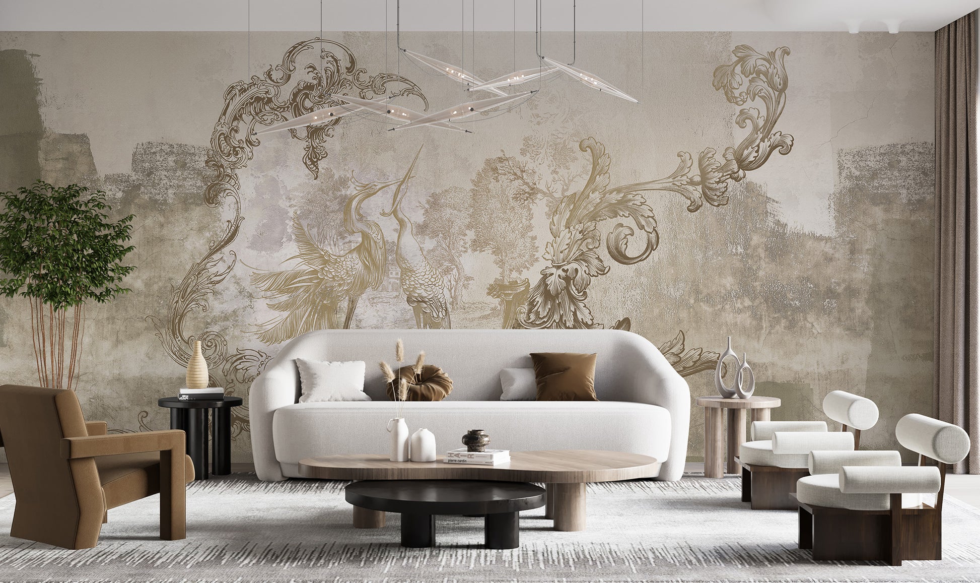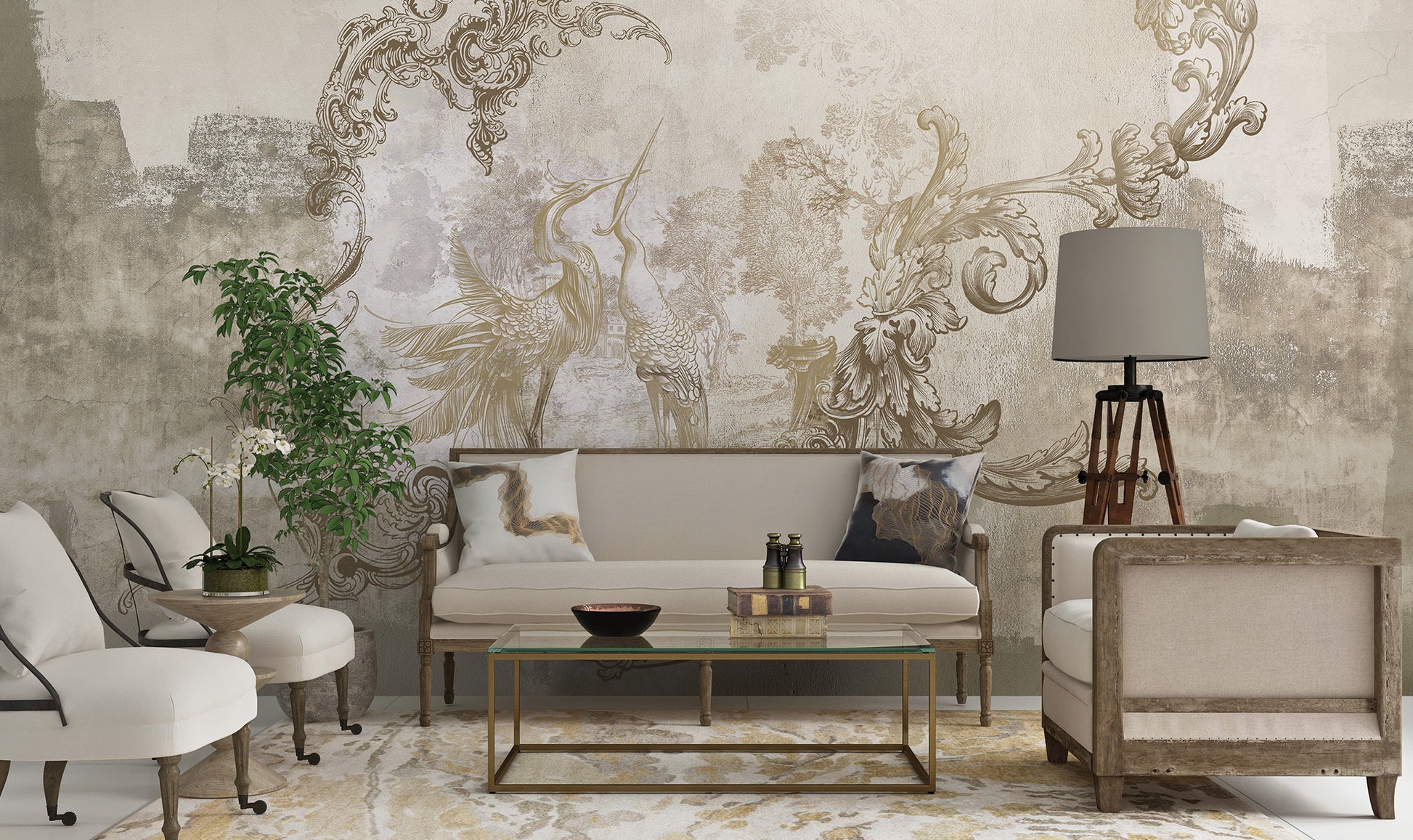 Розроблений для акцентних стін, цей фреска додає вишуканого характеру, не виглядаючи важким. Він чудово поєднується з сучасно-класичними інтер'єрами, теплими нейтральними кольорами, античними акцентами, латунними деталями, мармуровими текстурами та елегантним освітленням — ідеально підходить для будинків та бутикових готельних приміщень, які прагнуть створити розкішний настрій, натхненний історичною спадщиною.