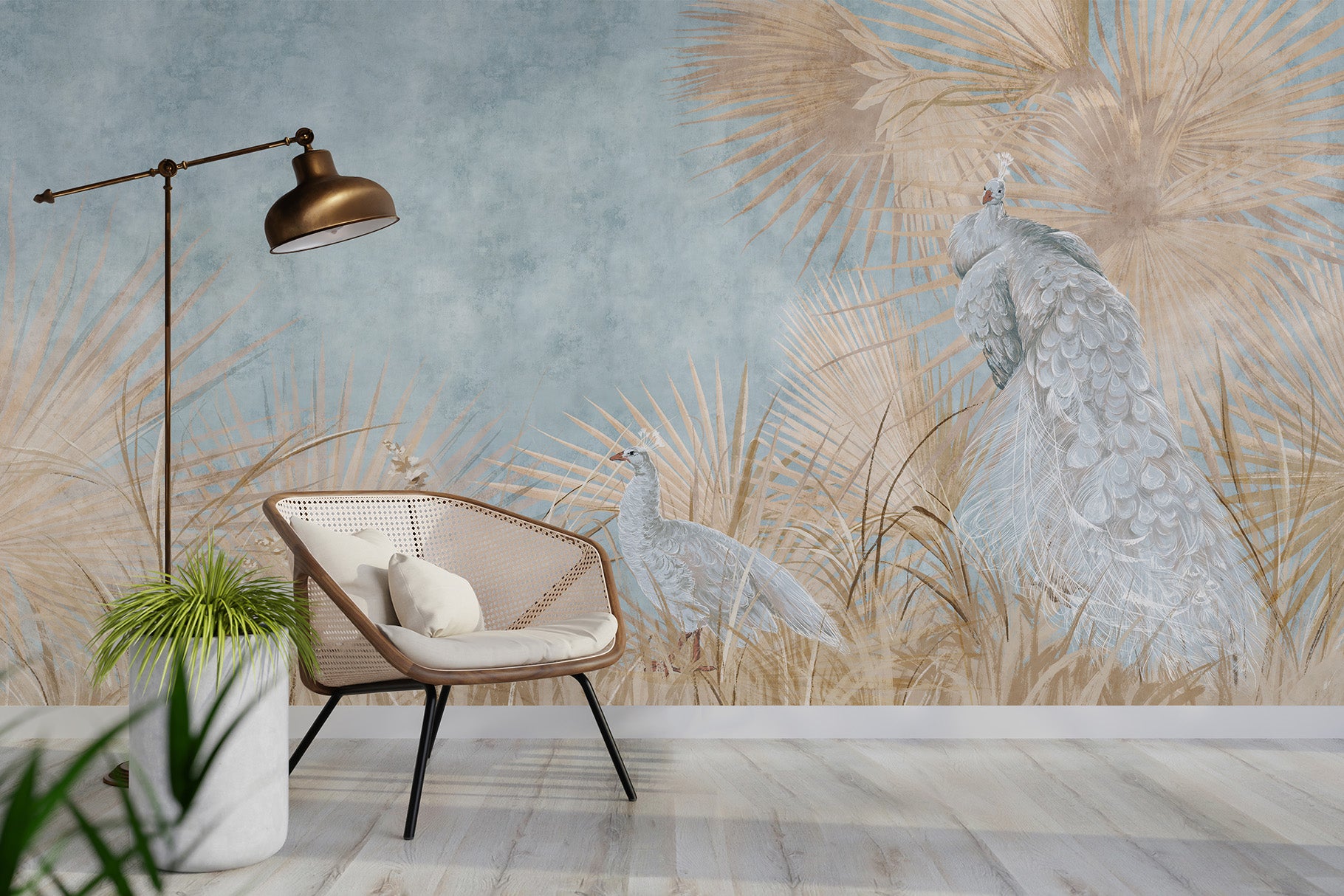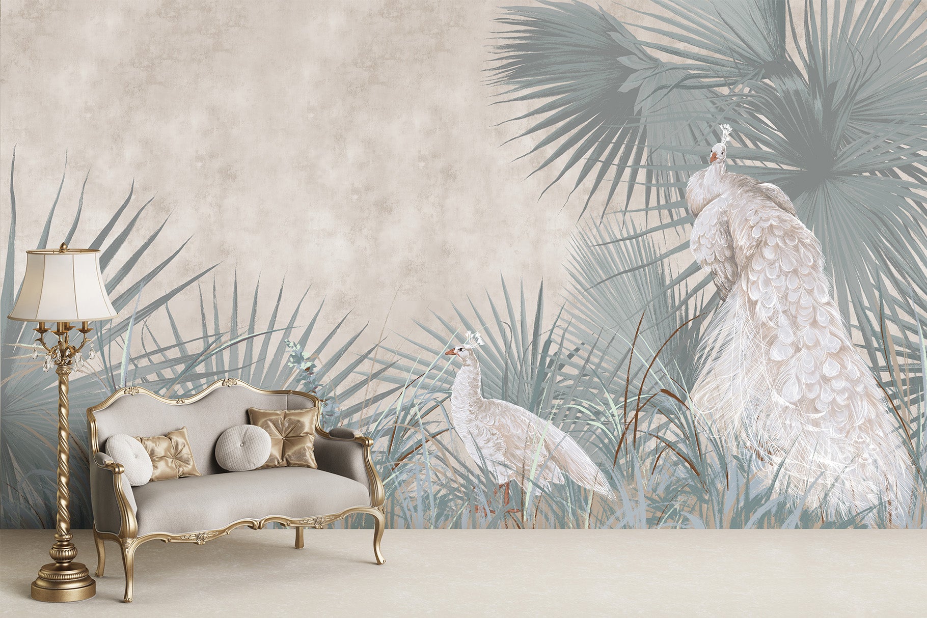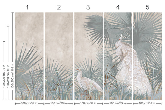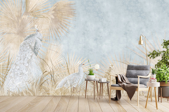 «Павичі з листям Фреско» – це фотошпалери у стилі фрески, які поєднують витончених павичів із пишним ботанічним листям, створюючи насичений декоративний, позачасовий вигляд. Оздоблення, натхненне фрескою, додає художньої глибини, водночас композиція залишається збалансованою та готовою до використання в інтер'єрі – ідеально підходять для створення виразної стіни з вишуканим виглядом.
